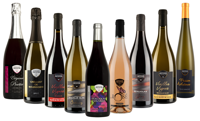 - nos pétillants : Crémant de Bourgogne (100% Chardonnay) et Elégance Picotin (effervescent Rosé 100% Gamay)